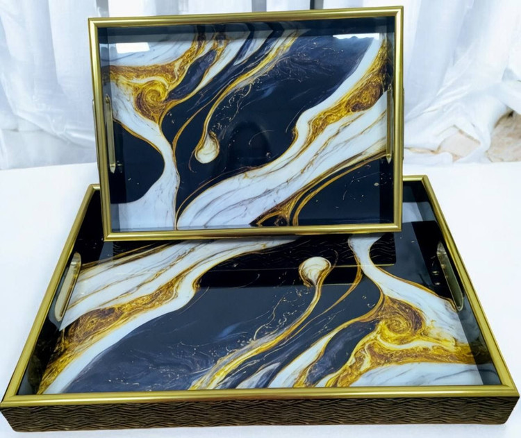 این محصول شامل دو سایز سینی است: یکی بزرگ برای سرو انواع خوراکیها و نوشیدنیها و یکی کوچکتر برای موارد سبکتر یا تزئینی. دستههای طراحی شده به شکل ارگونومیک، حمل و جابهجایی سینی را آسان میکنند.