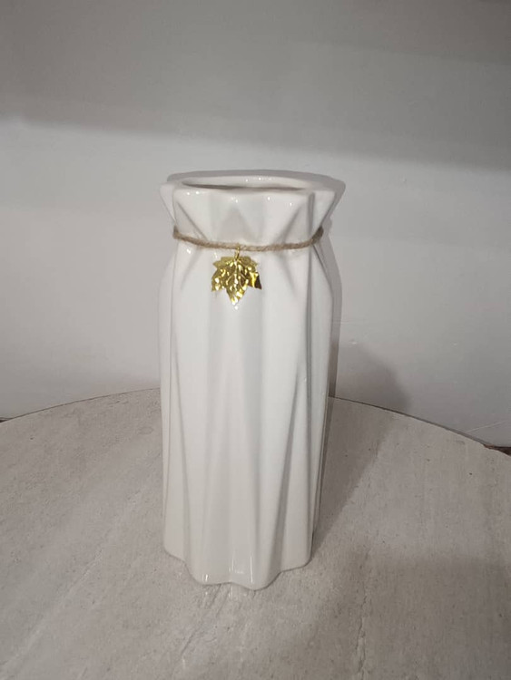 ساختهشده از سرامیک لعابدار باکیفیت دارای بافت و طرح خاص با رنگ ملایم و مدرن تزیین شده با نخ کنفی و آویز فلزی برای جلوهای طبیعی و شیک مناسب برای گلهای طبیعی، مصنوعی و خشک قابل استفاده در دکوراسیون منزل، میز کار، کافه و رستوران