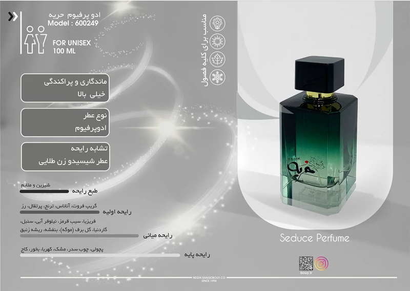 این ادوپرفیوم بوی ملایم و تقریباً خنکی دارد و برای استفاده در تمامی فصول سال بهغیراز زمستان پیشنهاد میشود. بطری این عطر خیلی شیک ساخته شده و بهخوبی در دست جا میشود.این عطر حجمی برابر با 100 میلیلیتر دارد و با توجه به غلظت خوبش تا مدت زیادی شما را از خرید عطر جدید بینیاز میکند. بهمحض اولین اسپری از این عطر روی پوست و محل نبضتان، متوجه بوی پرتقال، نارنج، گریپفروت، آناناس و گل رز خواهید شد. این ترکیب مرکباتی و میوهای با بوی شیرینش شادی و انرژی را به شما هدیه میکند. در ادامه و پس از مدتی این نتها جای خودشان را به نتهای میانی میدهند. نتهای میانی از گل فریزیا، گاردنیا، بنفشه، زنبق دره، نیلوفر و سیب قرمز ساخته شدهاند. بوی این گلها انرژی مثبت را در شما بیشتر میکنند. با گذشت زمانی طولانیتر شاهد جابهجایی نتهای میانی و پایانی خواهید شد. نتهای پایانی از گیاه پاتچولی، چوب سدر، بخار معطر، عنبر و مشک ساخته میشوند. بوی این ترکیب هیجان و تمرکز ویژهای را به شما هدیه میکند.خرید عطر حریه ، با توجه به پخش بوی قوی، ماندگاری خوب، شیشهی جذاب و شیک و حجم 100 میلیلیتریاش برای شما و کسی که این عطر را از شما هدیه میگیرد بسیار بهیادماندنی به نظر میرسد.