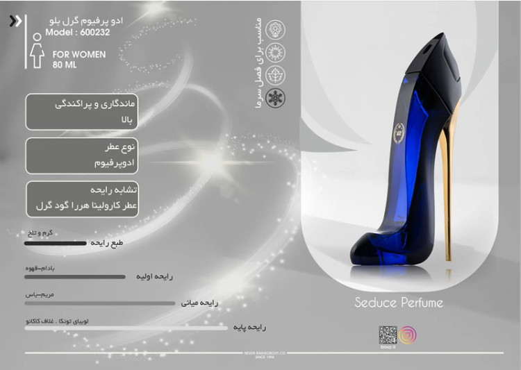 ادوپرفیوم blue girl ز آن دسته عطرهایی است که روی طراحی بطری تأکید بسیار زیادی دارد. بطری به شکل یک کفش مجلسی زنانه طراحی شده است.پاشنهی این کفش به رنگ طلایی است و درخشش خوبی در نور دارد. این کفش شیشهای بهراحتی در دست بانوان جا میشود. برای اسپریکردن این عطر کافی است قسمت بالایی بطری را فشار دهید. در این لحظه بوی بادام و قهوه در فضای اطراف پخش میشود. این ترکیب انرژی و هیجان را به شما هدیه میکند. پس از مدتی این نتها جای خودشان را به نتهای میانی میدهند. نتهای میانی از گل مریم و یاسمین ساخته شدهاند. بوی این گلها انرژی مثبت را به شما هدیه میکند. در ادامه شاهد جابهجایی نتهای میانی و پایانی خواهید بود. این نتهای پایانی از دانهی تونکا و کاکائو تشکیل میشوند. بوی شیرین این ترکیب دوگانه شادی و نشاط شما را بیشتر میکند.blue girl برای استفاده در فصول پاییز و زمستان پیشنهاد میشود.
