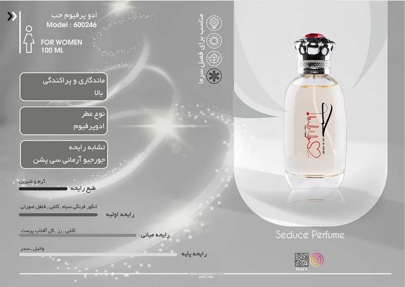 عطر حب با داشتن رایحه ای مدیترانه ای ، مناسب برای روزهای خنک پاییزی می باشد . رایحه گرم و شیرین این محصول زنانه حس وقار ، حلاوت و جذابیت خاصی به خانم ها بخشیده است . این عطر با ماندگاری بسیار بالا و پخش بوی عالی فراموش نشدنی ، محرک و فوق العاده جذاب است . با اولین اسپری از این عطر زنانه بر روی نبض خود به سرعت متوجه رایحه های گل فریزیا و برگ انگور فرنگی سیاه می شوید و سپس این نت ها جای خود را به نت های رز ترکی، نرولی، اسمانتوس و یاس مصری می دهند و در انتها رایحه های برگ نعناع برزیلی و وانیل است که ماندگار می شود.