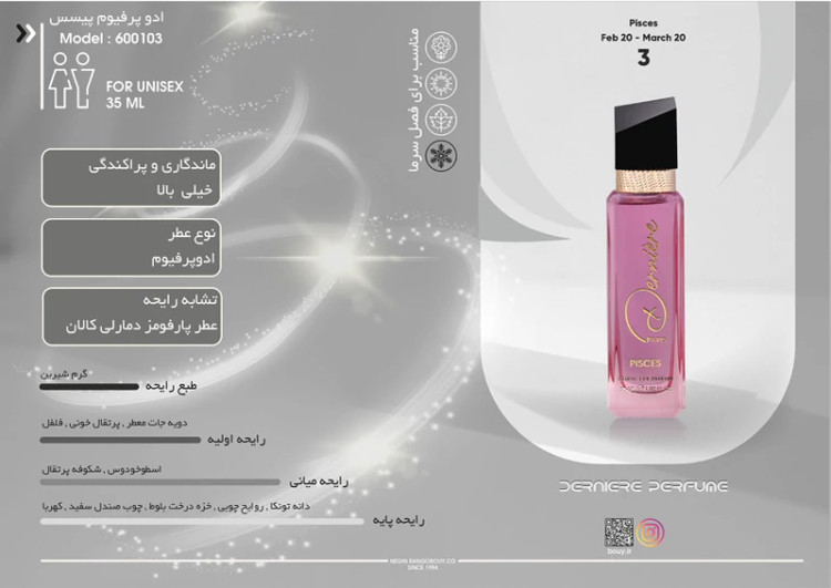 عطر 35 میل3 PISCES یک رایحه لوکس و جذاب است که به طور ویژه برای افرادی که به دنبال عطری خاص و ماندگار هستند، طراحی شده است. این عطر با ترکیبی پیچیده و استثنایی از نتهای گلها، چوبها و ادویهها، تجربهای متفاوت و منحصر به فرد را به مشام میرساند.