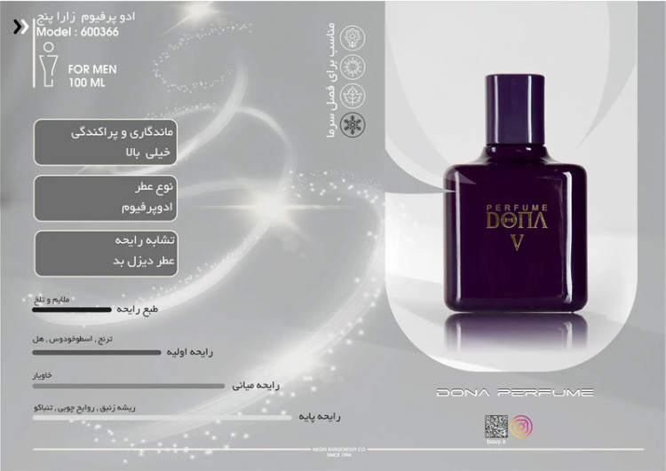 عطری است خنک، تلخ و خوشبو که با رایحه شاداب، گیاهی و نیمه شیرین اسطوخدوس آغاز میشود که حسی مرکباتی در کنارش باعث افزایش شادابی عطر شده و رایحه هل نیز تلخی ملایمی را در کنارشان ایجاد میکند. با گذر زمان حس کلی رایحه تغییر چندانی ندارد و کماکان شاداب، گیاهی و مرکباتی باقی میماند و در قسمت میانی و پایه تنها با اضافه شدن رایحه ضعیفی از چوبها کمی تلخ تر و رسمی تر میگردد. در گروه بویایی چوبی معطر که عطرهای بسیار جذابی را در خود جای داده است، قرار دارد. سبک بویی این عطر معتدل می باشد . از اسانس های بکار برده شده در این عطر می توان به ترنج ، اسطوخودوس ، هل ، خاویار، ریشه زنبق، تنباکو ، روایح چوبی اشاره کرد.
