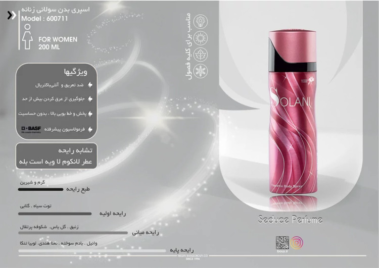 این اسپری شما را به عنوان یک خانم شاد، پر انرژی و پر از انگیزه نشان می دهد.این محصول با رایحه گرم خود، عطری برای پاییز و زمستان است.پخش بوی اسپری سولانی زیاد است.این رایحه به سرعت در فضا پراکنده می شود و شما و اطرافیانتان را مست خواهد کرد. اسپری سولانی می تواند از شما رد بوی خوبی بر جای بگذارد.