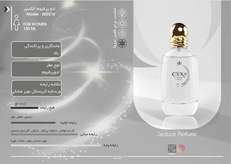 عطر الگزیر عطریست گرم و تلخ . این عطر با رایحه ای گرم که آن را بیشتر از گل یاسمن ،نارگیل و فلفل سیاه موجود در ترکیباتش حاصل می کند ، بهترین انتخاب برای شب های سرد و برفی زمستانی و یا میهمانی های رسمی و شبانه می باشد . عطر الگزیر هواداران بسیاری را از همان روزهای اول ورودش به بازار به خود اختصاص داد با طراحی زیبایی که دارد بسیار جلب توجه کرده و رایحه ی کهربا و مشک موجود در ترکیباتش این محصول را بسیار مرموز و متمایزتر جلوه می دهند. این ادوپرفیوم ماندگار با میزان پراکنندگی عالی بوده و دارای رایحه ای قوی و فشرده می باشد. این محصول یکی از بهترین عطرهای شرقی unisex (مردانه و زنانه) است .