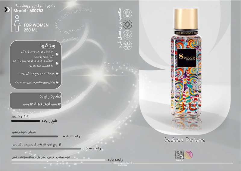 به عنوان یک عطر گلدار ، میوه ای و خوراکی همراه با رایحه ای از توت های وحشی و نارنگی آبدار می باشد . رایحه میانی آن شامل ترکیب لطیفی از پیچ امین الدوله ، یاسمن و یاس است در حالی که رایحه پایه ما را در انتظار یک قطعه موسیقی احساساتی از کهربا ، کارامل ، وانیل ، چوب صندل و بادام سوخته می گذارد . بوی غالب و اصلی آن وانیل ، کارامل و بادام سوخته است
