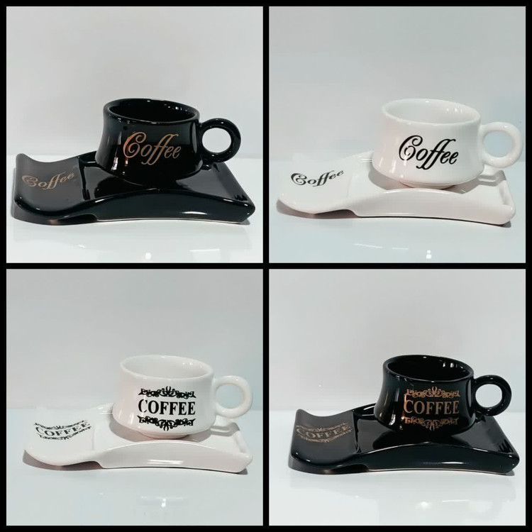 این ست با طراحی خاص و منحنیشکل زیره، فوراً توجه را جلب میکند. تایپوگرافی برجسته کلمه "Coffee" روی هر فنجان در کنار ترکیب رنگهای کلاسیک سفید و مشکی، ظاهری شیک و مدرن به آن داده است. زیره بهگونهای طراحی شده که علاوه بر جایگیری فنجان، فضای مخصوص برای قاشق یا شیرینی نیز فراهم باشد.